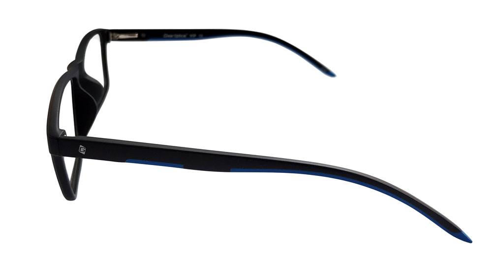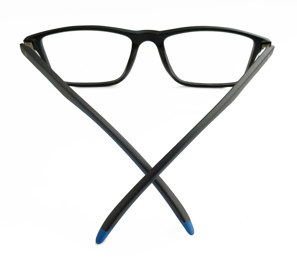 Montura en Tr-90, liviana y súper cómoda. En un estilo clásico que se adapta a la mayoría de los rostros. Brazos en color negro combinado con azul