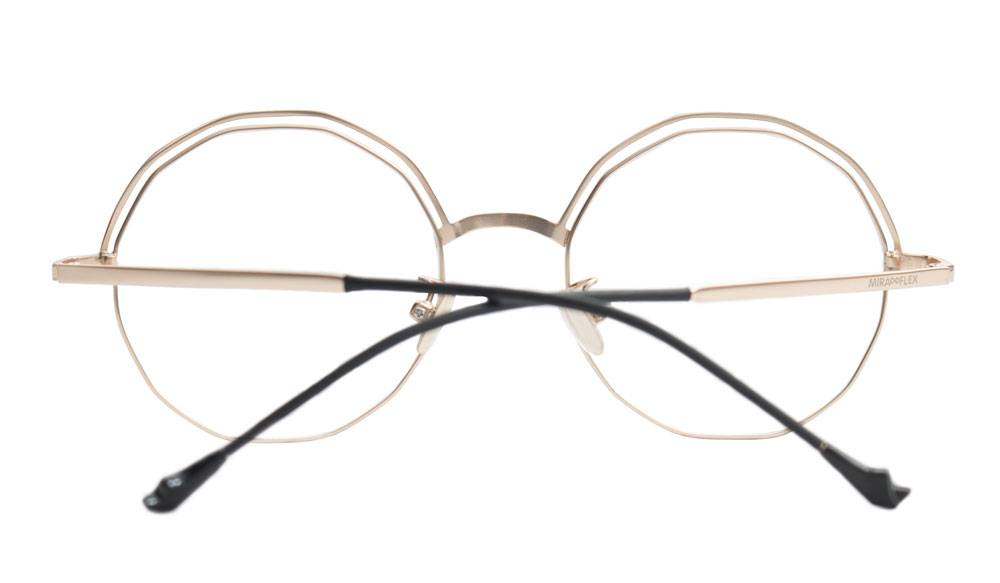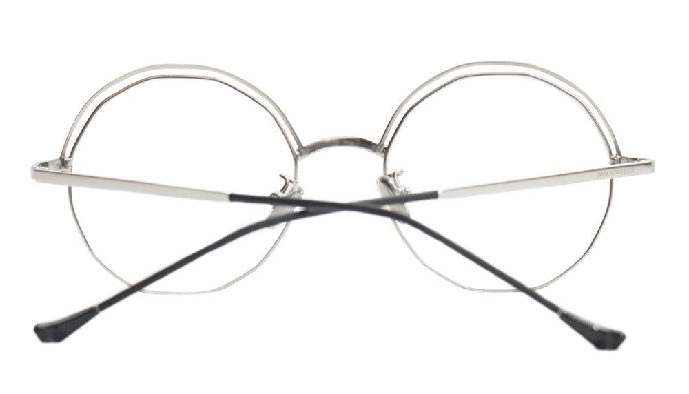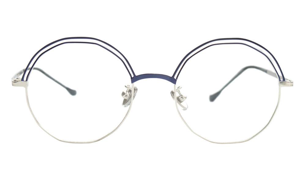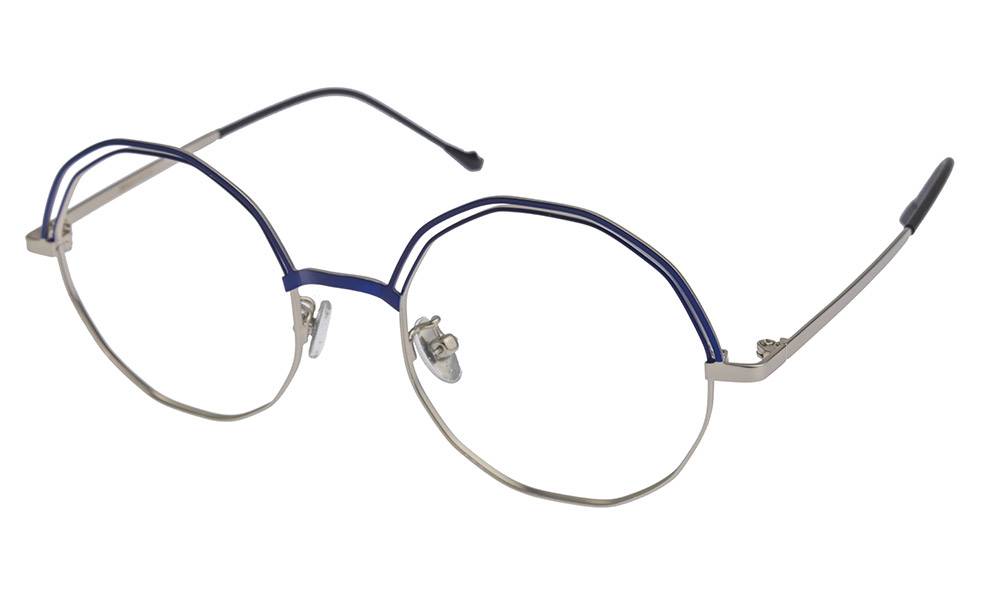 Montura metálica con doble aro superior y puente sencillo, ideal para jóvenes y adultos. De forma hexagonal , esta montura combina un color negro o azul el el borde superior con borde inferior plateado o dorado y brazos metálicos. Estilo moderno y juvenil que está actualmente de moda.