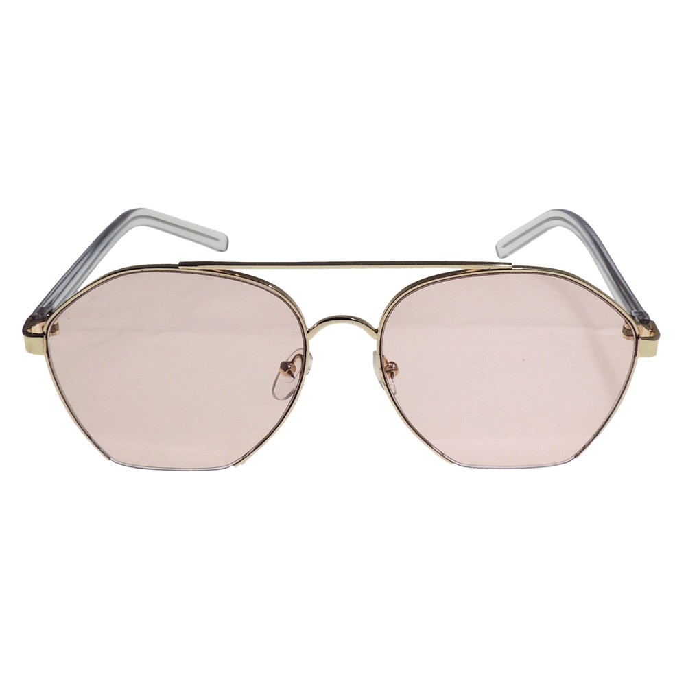 Montura metálica dorada con doble puente. Estas gafas de sol tienen forma irregular con una porción al aire en la parte inferior. Brazos cubiertos con plástico. Lentes de sol color rosado. Son ideales para personas que disfruten la sencillez de la moda.