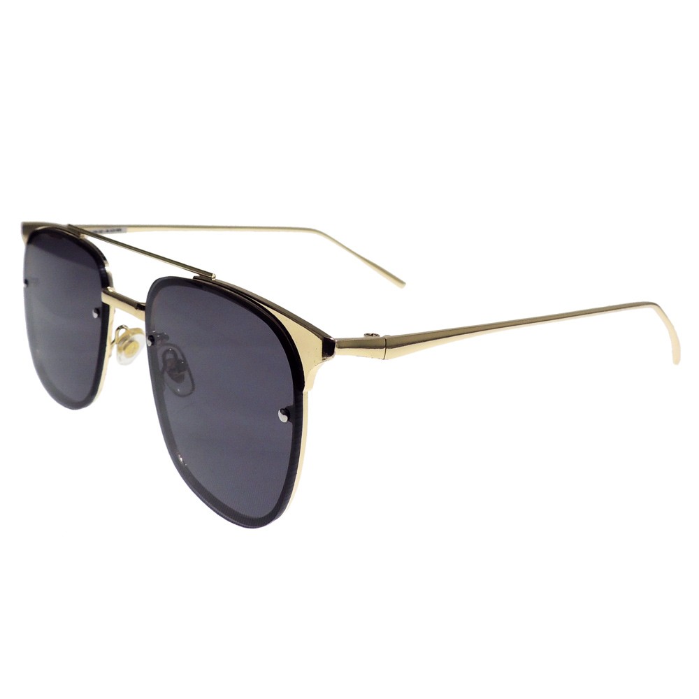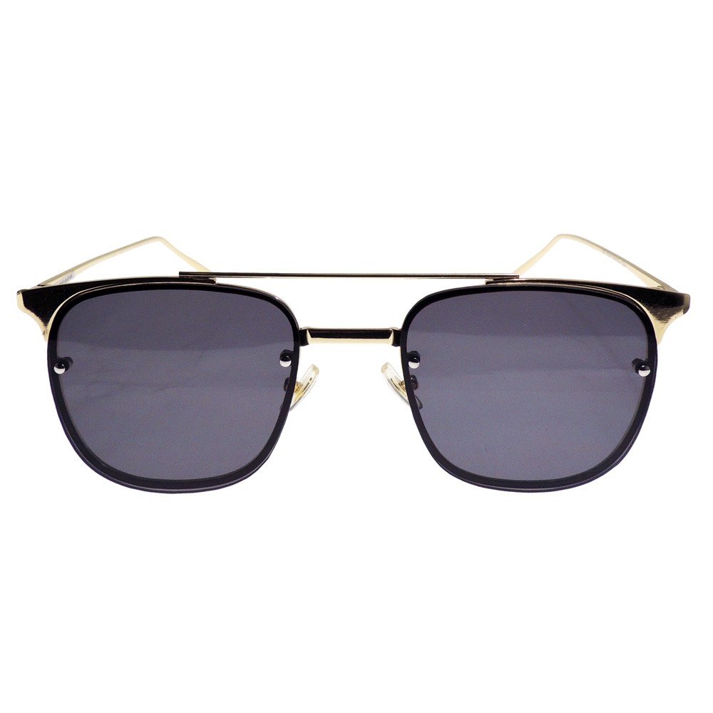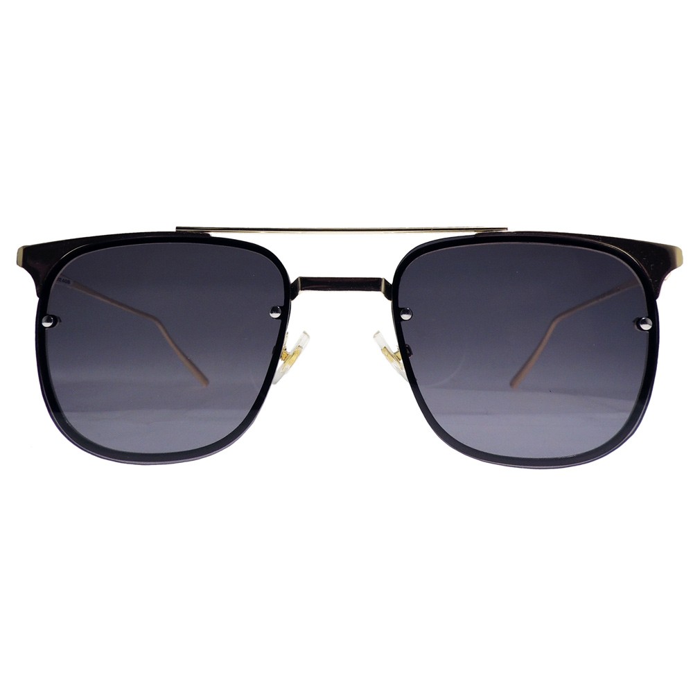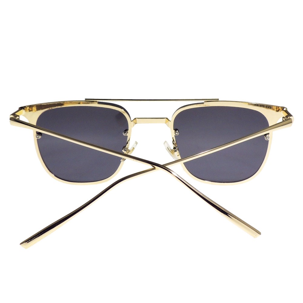 Montura de forma clásica que combina perfectamente con diseño moderno, ideal para aquellas personas que disfrutan la moda que nunca cambia. Montura metálica de doble puente dorada con lentes de sol sobrepuestos sobre el aro metálico. Lentes color gris con protección UV.