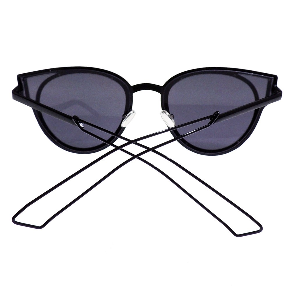 Montura metálica en color negro con lentes de sol color gris. Borde metálico con extensión en la parte superior temporal dándole una forma angular a estas gafas redondas. Los brazos terminan en forma angula en metal delgado. 100% Protección UV.
