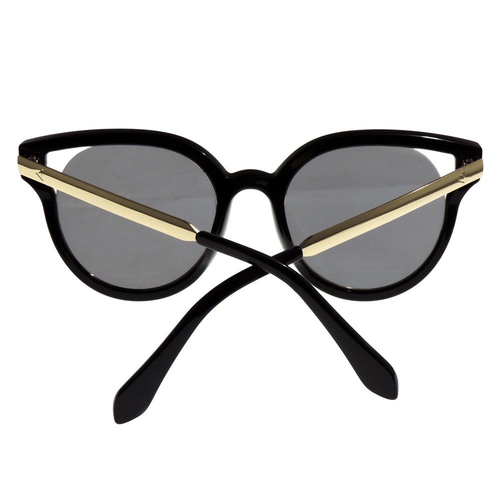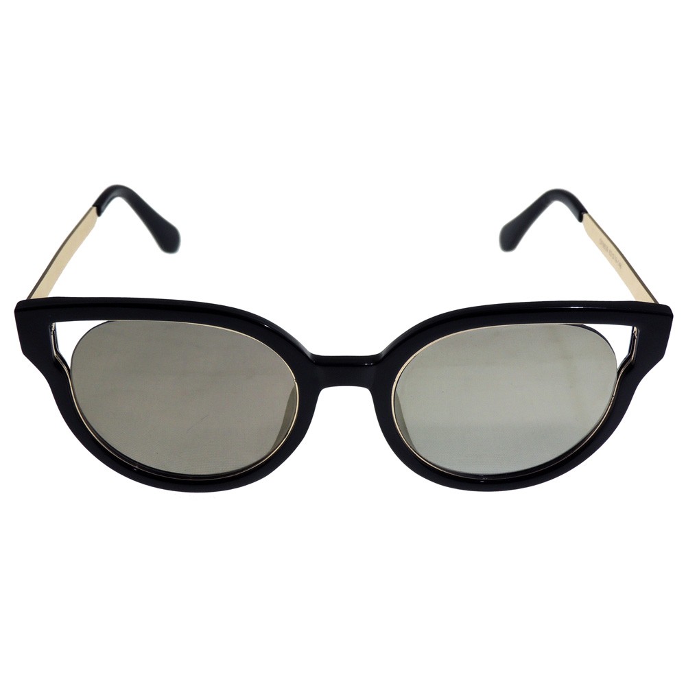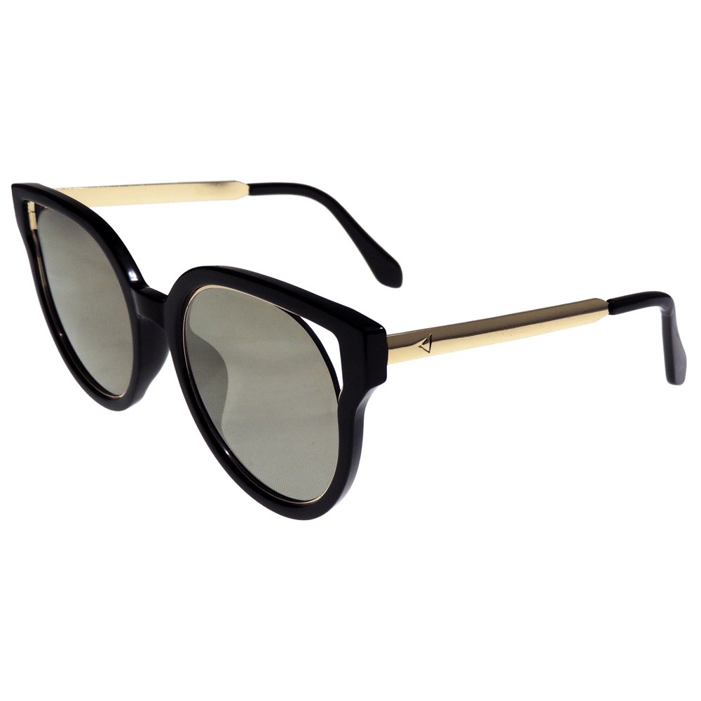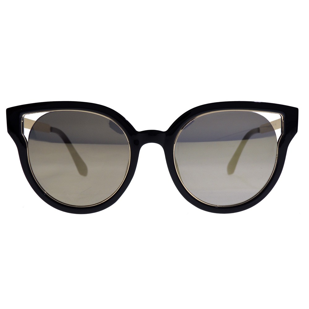 Montura moderna que combina materiales, colores y estilos ideal para mujeres de vanguardia. Montura en metálica dorada bordeada con un marco en acetato color negro. Sus brazos son metálicos con terminales en plástico color negro. Lentes redondos espejados color amarillo-gris.