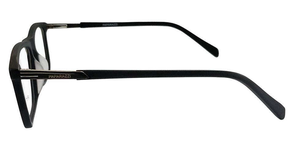 Montura en acetato color negro, por su forma rectangular se adapta a la mayoría de los rostros.