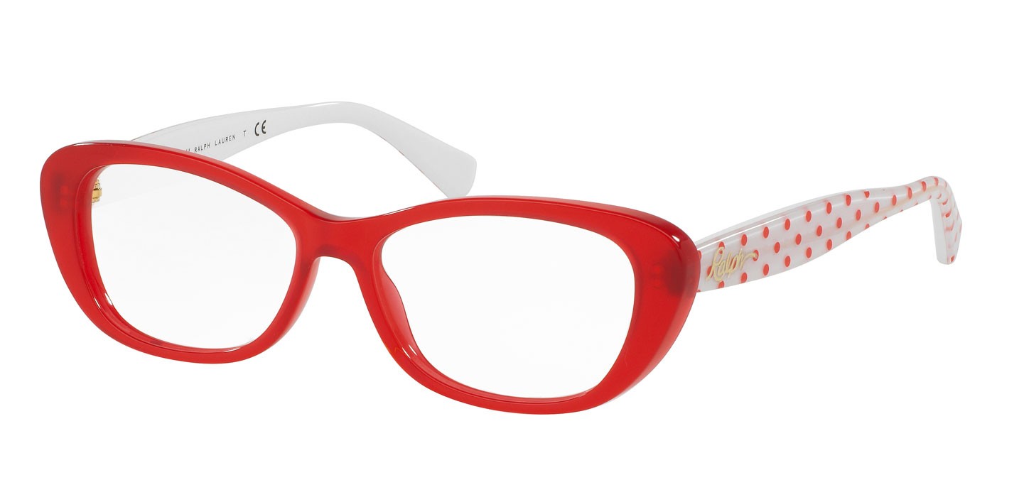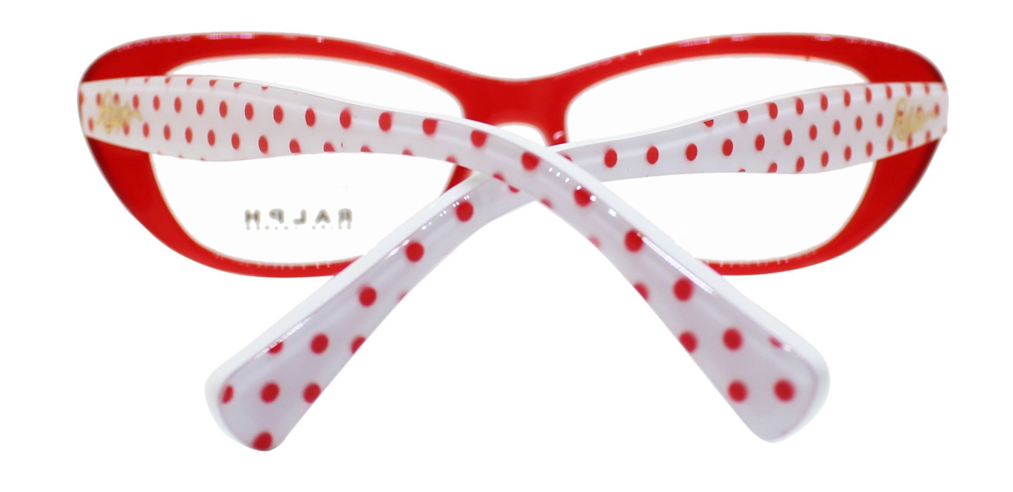 En este diseño Ralph combina calidad, estilo y moda. Uno de los nuevos modelos de Ralph con estilo mariposa y colores vivos. Montura en acetato con frente rojo y patas blancas con puntos rojos.