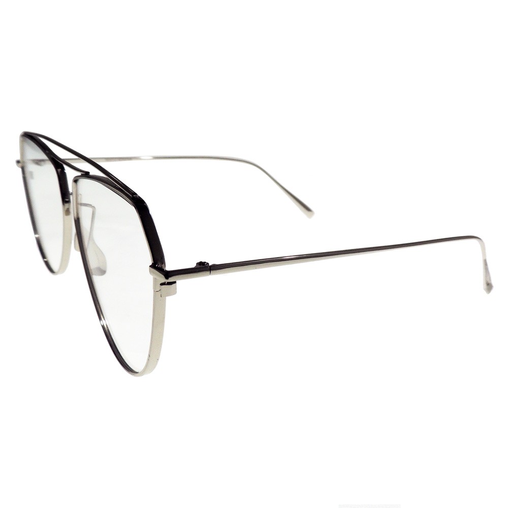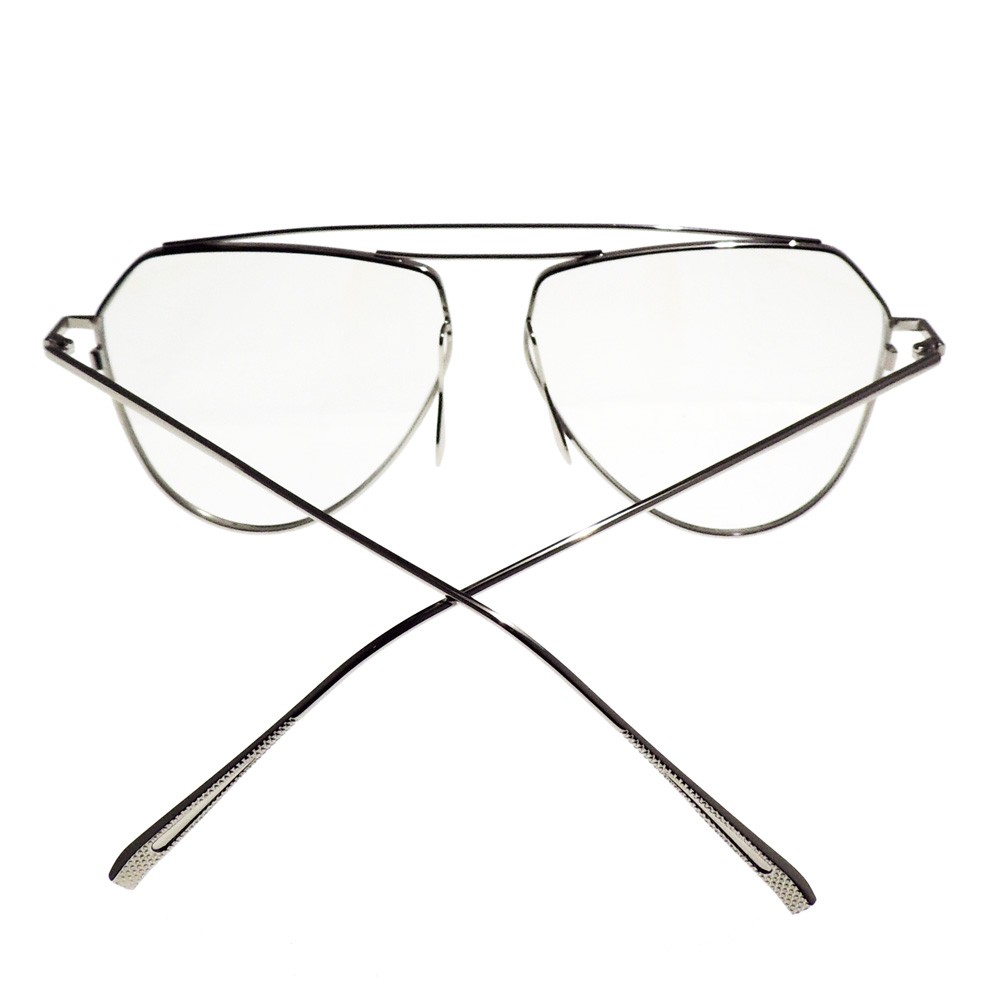 Montura metálica, estilo aviador modificado, con doble puente único y moderno y plaquetas metálicas estilo lágrima, ideal para las personas clásicas que disfrutan el estilo aviador y quieren dar un toque diferenciador. Filtro UV 100% protección. Lentes transparentes con visos azules.