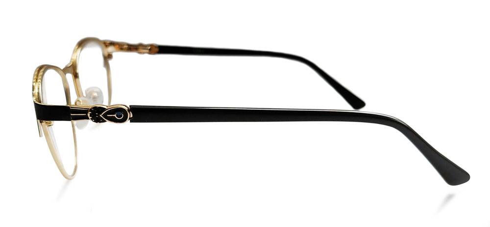 Diseño que combina la elegancia con el estilo. La montura VERA ha sido creada para mujeres que quieren estar a la moda y a la vez sentirse cómodas. Montura metálica color negro con aro y brazos color dorado. Bisagra Flex.